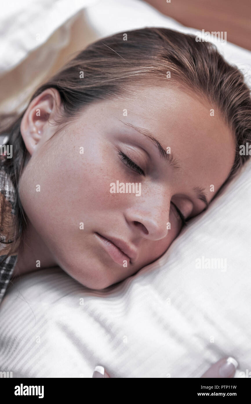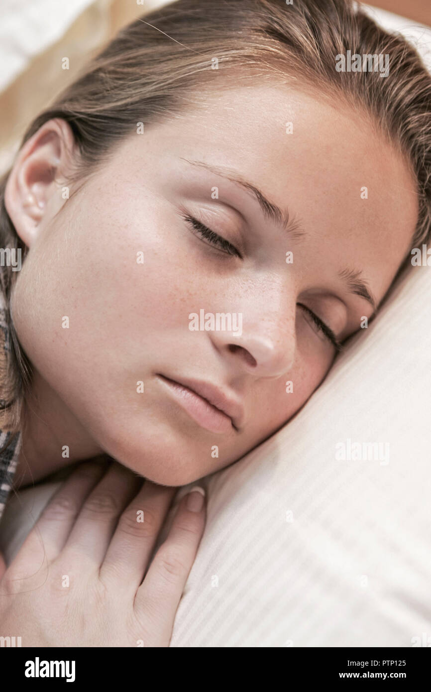 Frau Bett Schlafen Schlaf Frauen Erwachsene Geschlossene Augen Person Stock Photo Alamy
