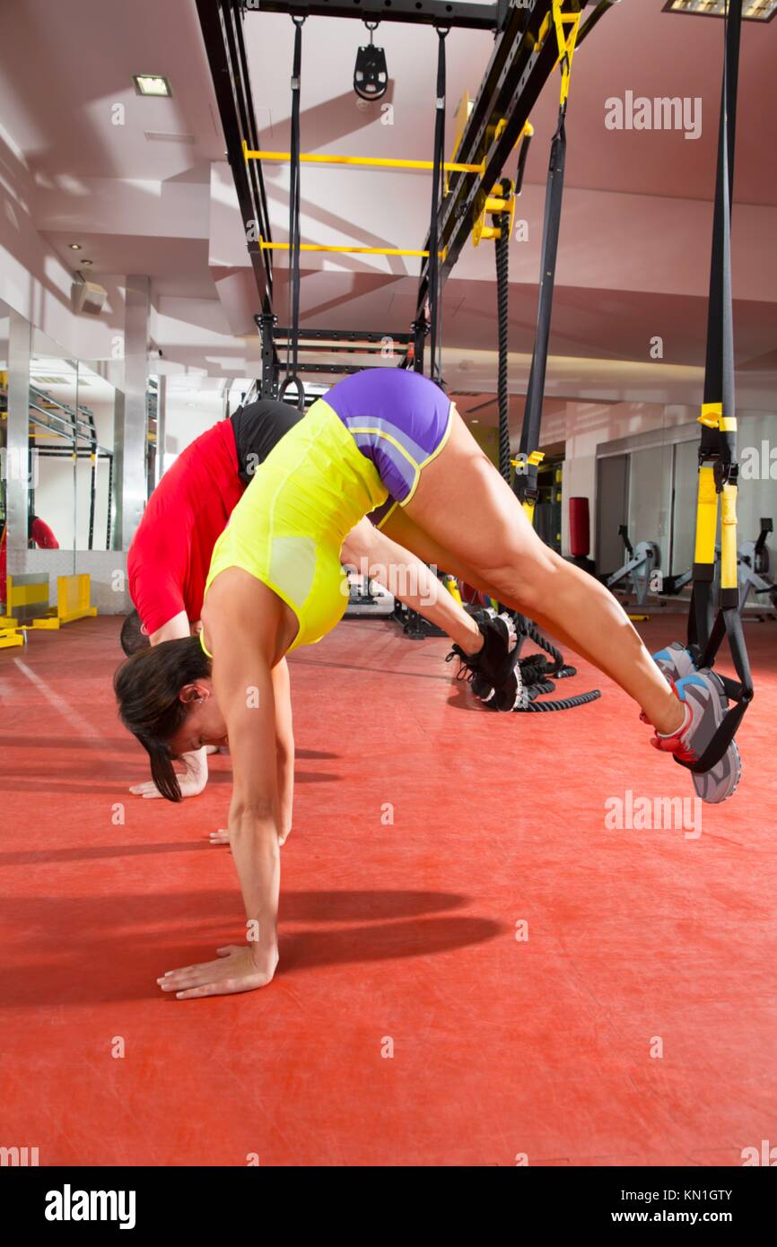 Crossfit Fitness Trx Training Exercises At Gym Woman And Man Push Up Stock Photo Alamy