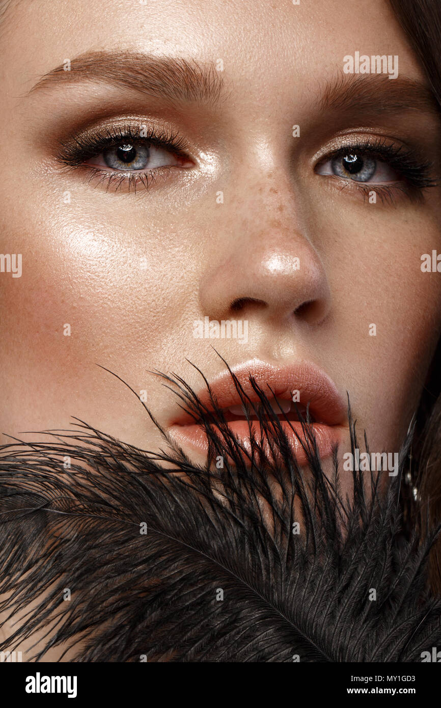 Ein Schones Madchen Mit Abend Make Up Ein Hollywood Wave Und Eine Schwarze Feder In Der Hand Schonheit Gesicht Stockfotografie Alamy