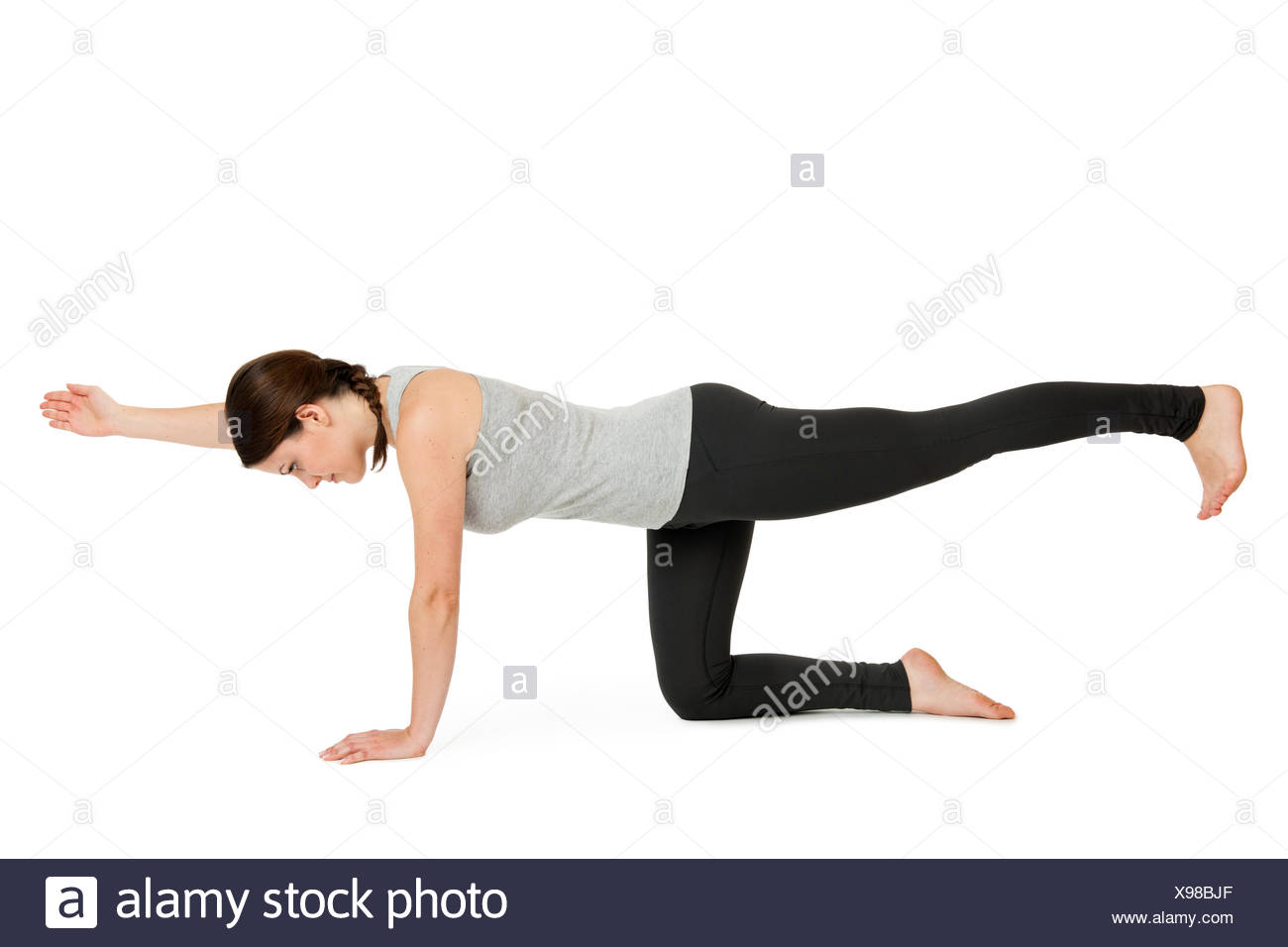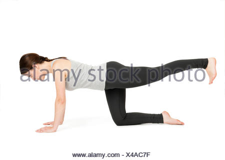 Seitliche Ganzkorper Ansicht Einer Jungen Frau Vor Weissen Hintergrund Die Yoga Ubung Diagonale Katze Majariasana Zeigend Stock Photo Alamy