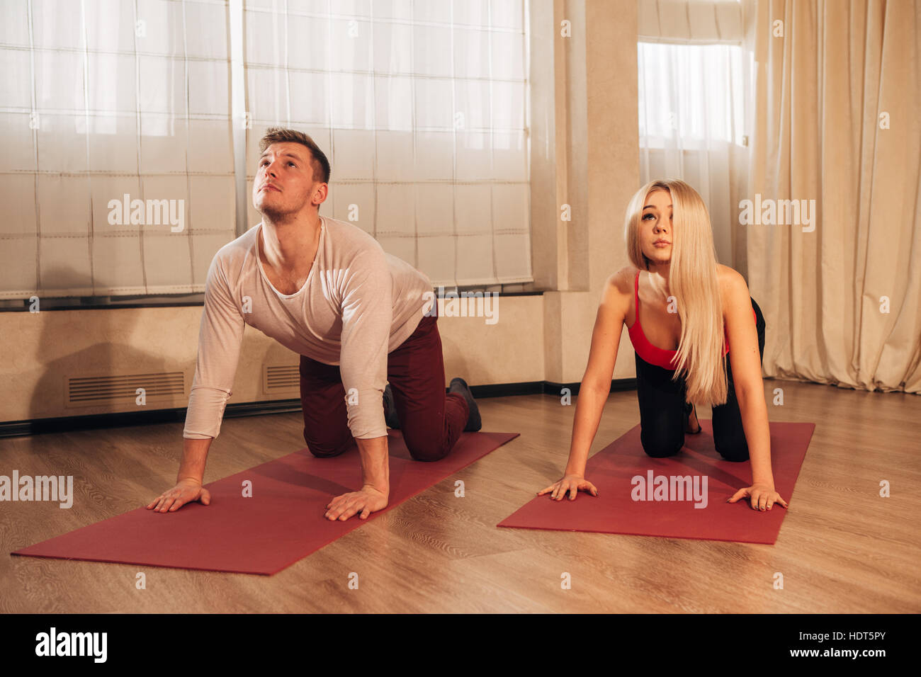 Junger Mann Und Frau Beim Yoga Ubung Katze Stockfotografie Alamy