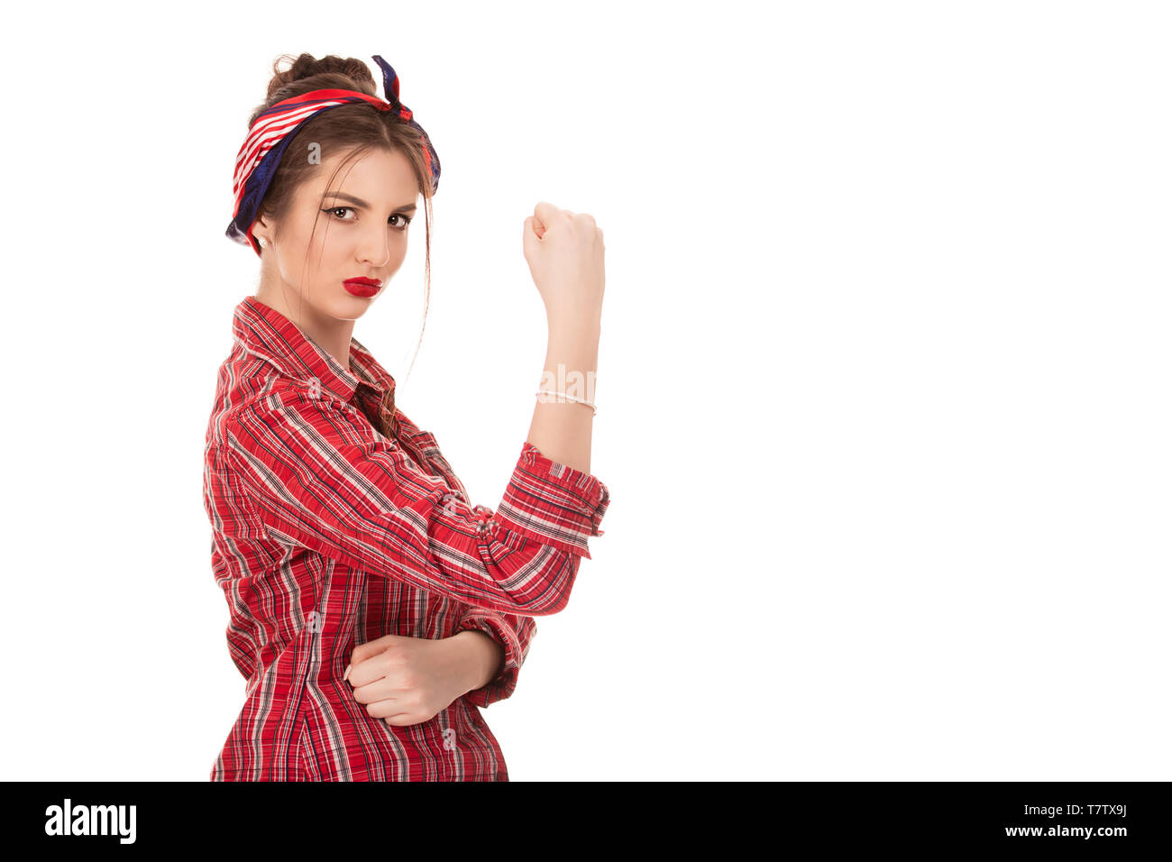 Starke Und Selbstbewusste Frau Die Mit Einer Geballten Faust Rollt Ihre Hulse Symbol Der Amerikanischen Frauen Lib Bewegung Rosie Nietmaschine Isoliert Auf Weissem Stockfotografie Alamy