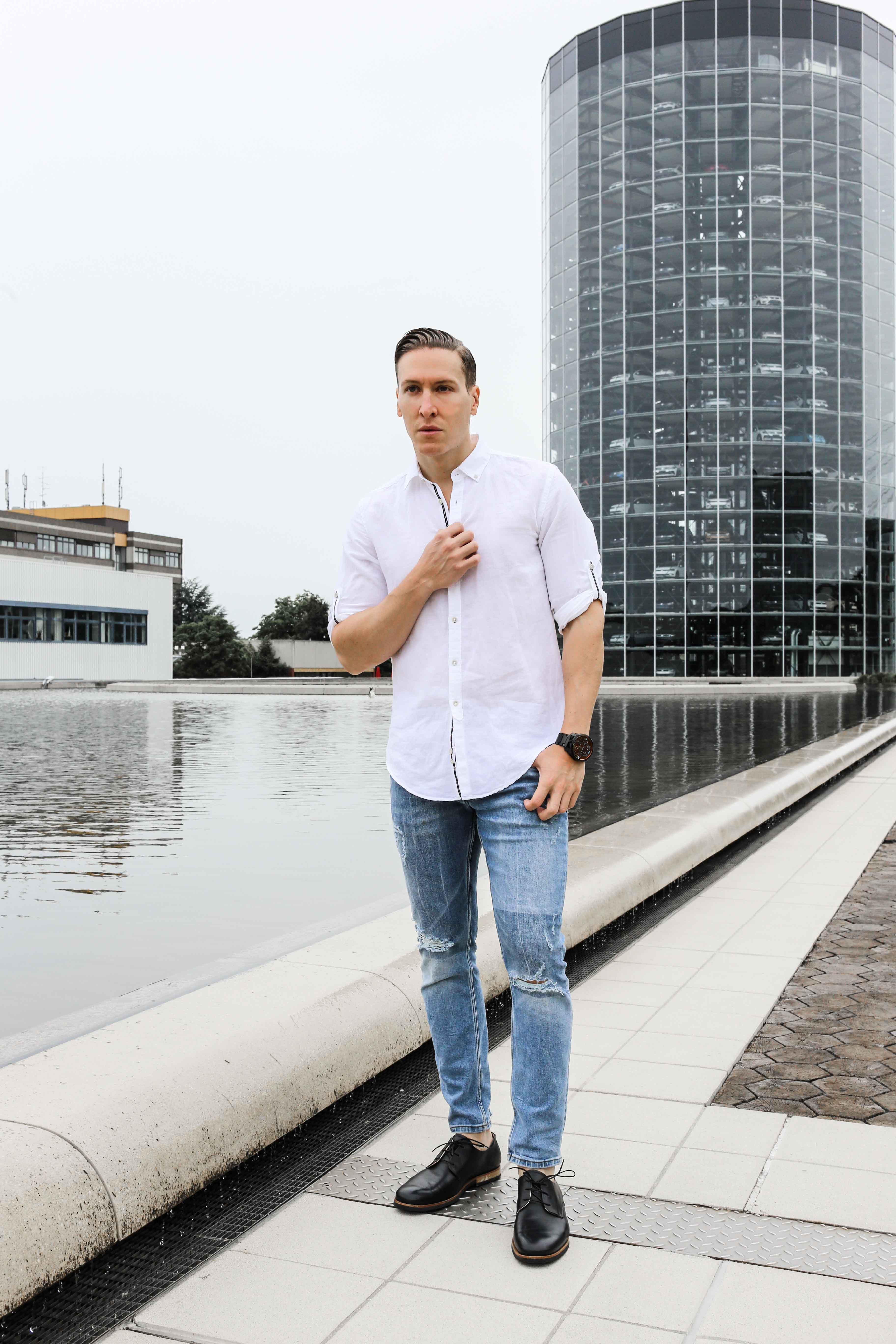 Sommer Look Weisses Leinenhemd Ripped Blue Jeans Und Freizeit Lederschuhe
