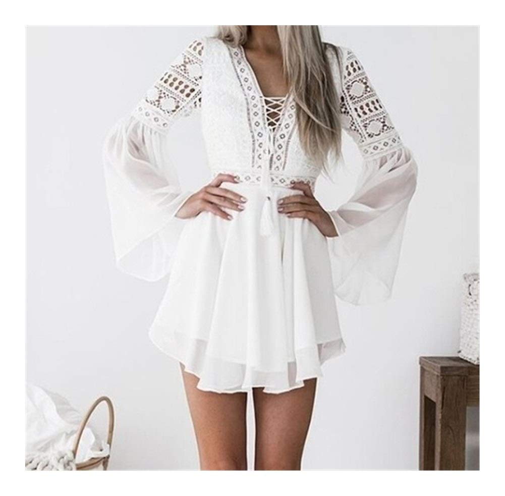 Fanessy Frauen Solid Spitze Weisses Kleid Reizvolle Tiefe V Langarm Skater Amazon De Bekleidung