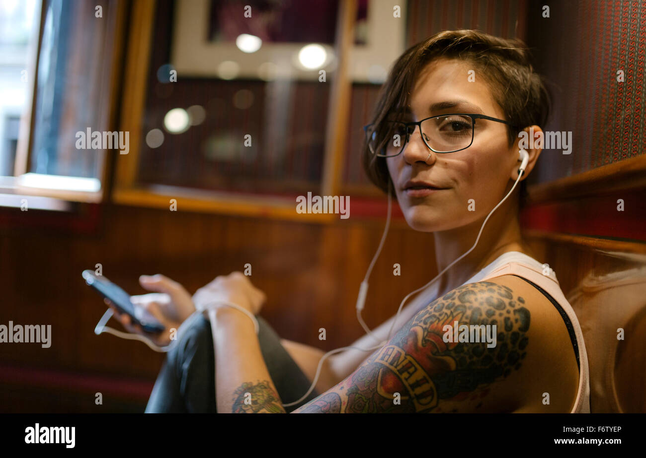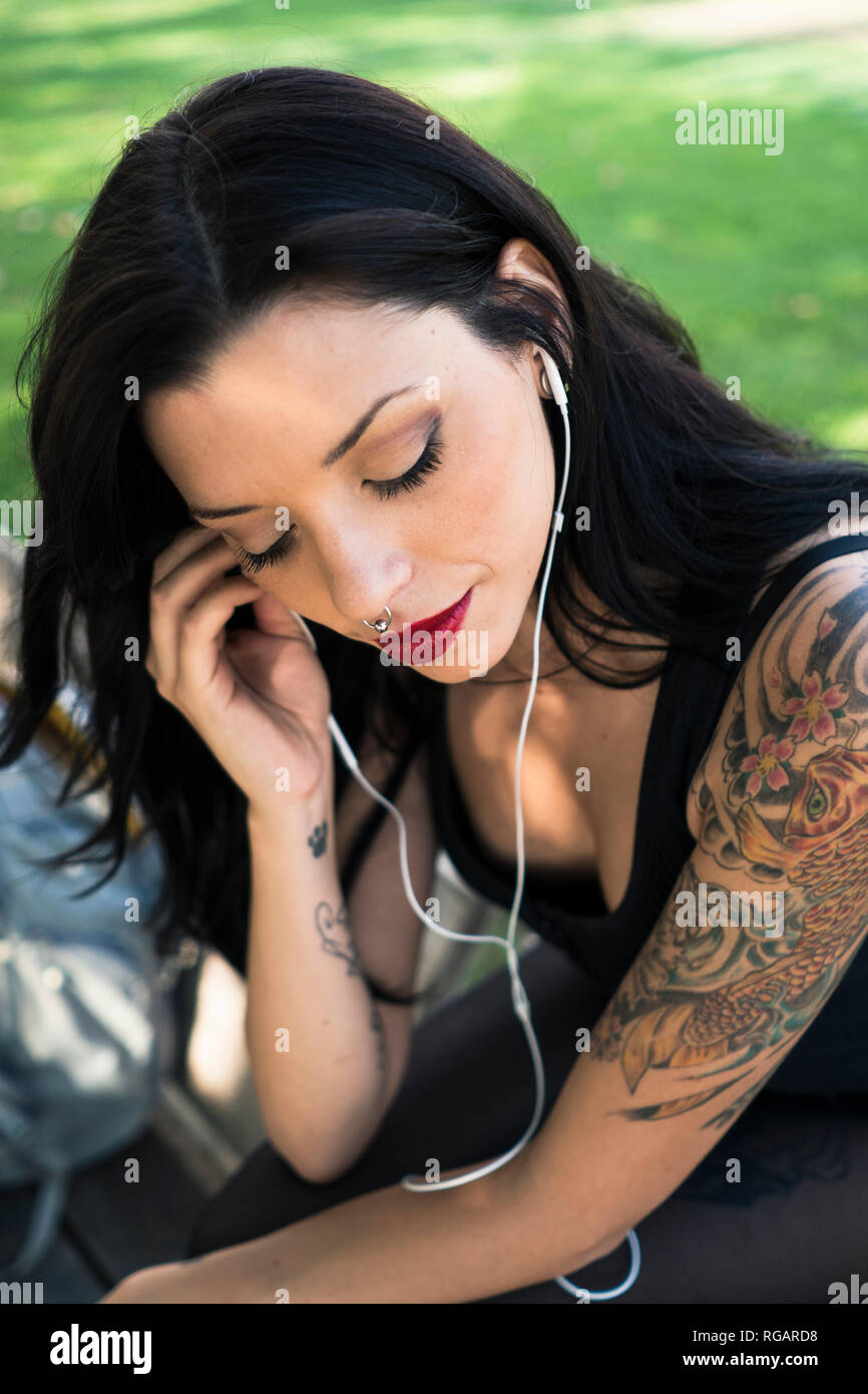 Junge Frau Mit Tattoos Auf Dem Arm Das Anhoren Von Musik Uber Kopfhorer Stockfotografie Alamy