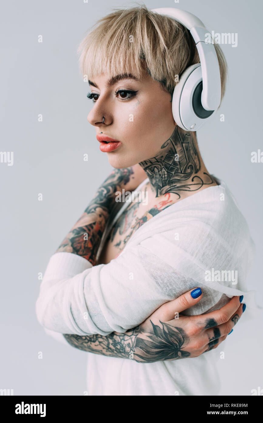 Attraktive Frau Mit Tattoos Musik Horen Uber Kopfhorer Isoliert Auf Grau Stockfotografie Alamy
