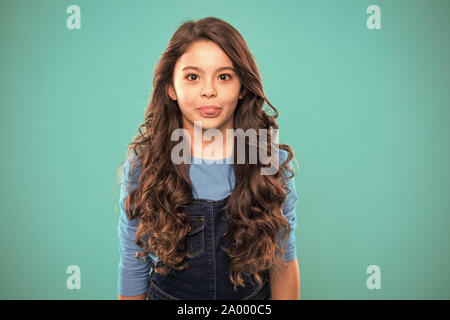 Extreme Haar Volumen Kind Madchen Lange Gesund Glanzendes Haar Kleines Madchen Lange Haare Wachsen Lehre Gesundes Haar Pflege Gewohnheiten Kind Glucklich Suss Gesicht Mit Adorable Curly Frisur Stehen Auf Blauem Hintergrund Stockfotografie