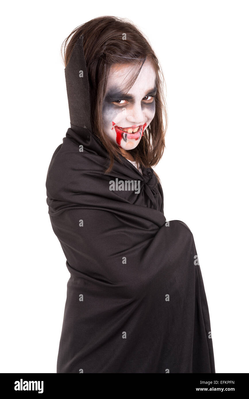 Madchen Mit Gesicht Malen Und Halloween Vampir Kostum Isoliert In Weiss Stockfotografie Alamy