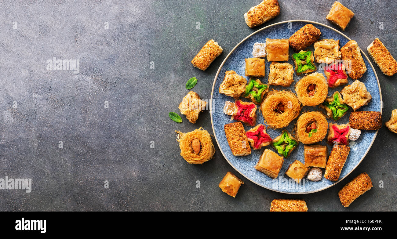 Set Von Verschiedenen Traditionellen Ostlichen Desserts Verschiedene Arabische Sussigkeiten Auf Holztisch Baklava Halva Rahat Lokum Fruchteis Nusse Pistazien Datteln Rosinen Kadayif In Einem Bunten Teller Von Oben Lizenzfreie Fotos Bilder