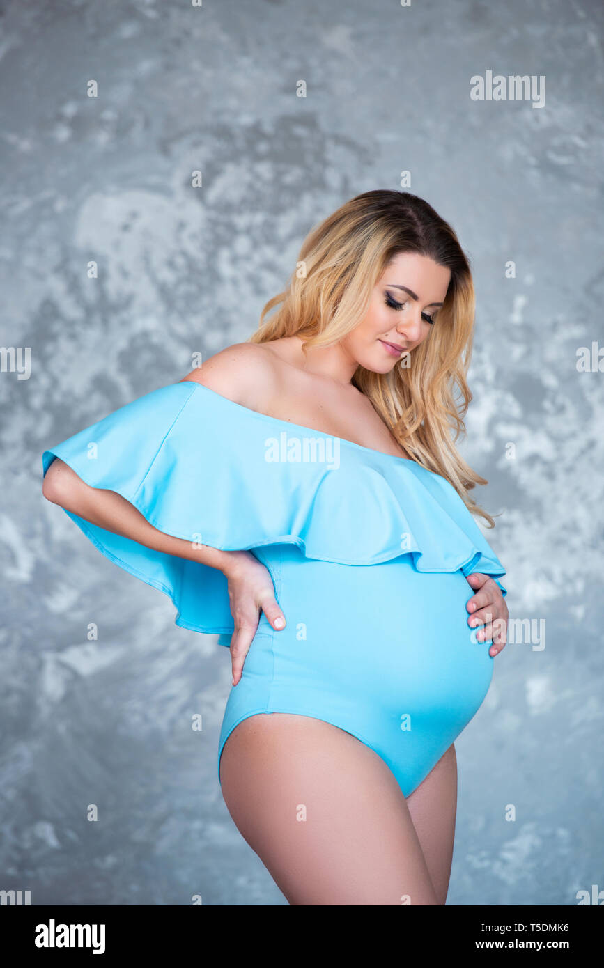 Schone Junge Schwangere Blonde Frau In Einem Blauen Anzug Korper Gegen Eine Graue Betonwand Hintergrund Die Gesundheit Der Frauen Und Schone Schwangerschaft Stockfotografie Alamy
