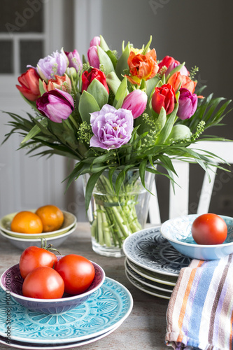 Strauss Aus Bunten Tulpen Mit Geschirr Kaufen Sie Dieses Foto Und Finden Sie Ahnliche Bilder Auf Adobe Stock Adobe Stock