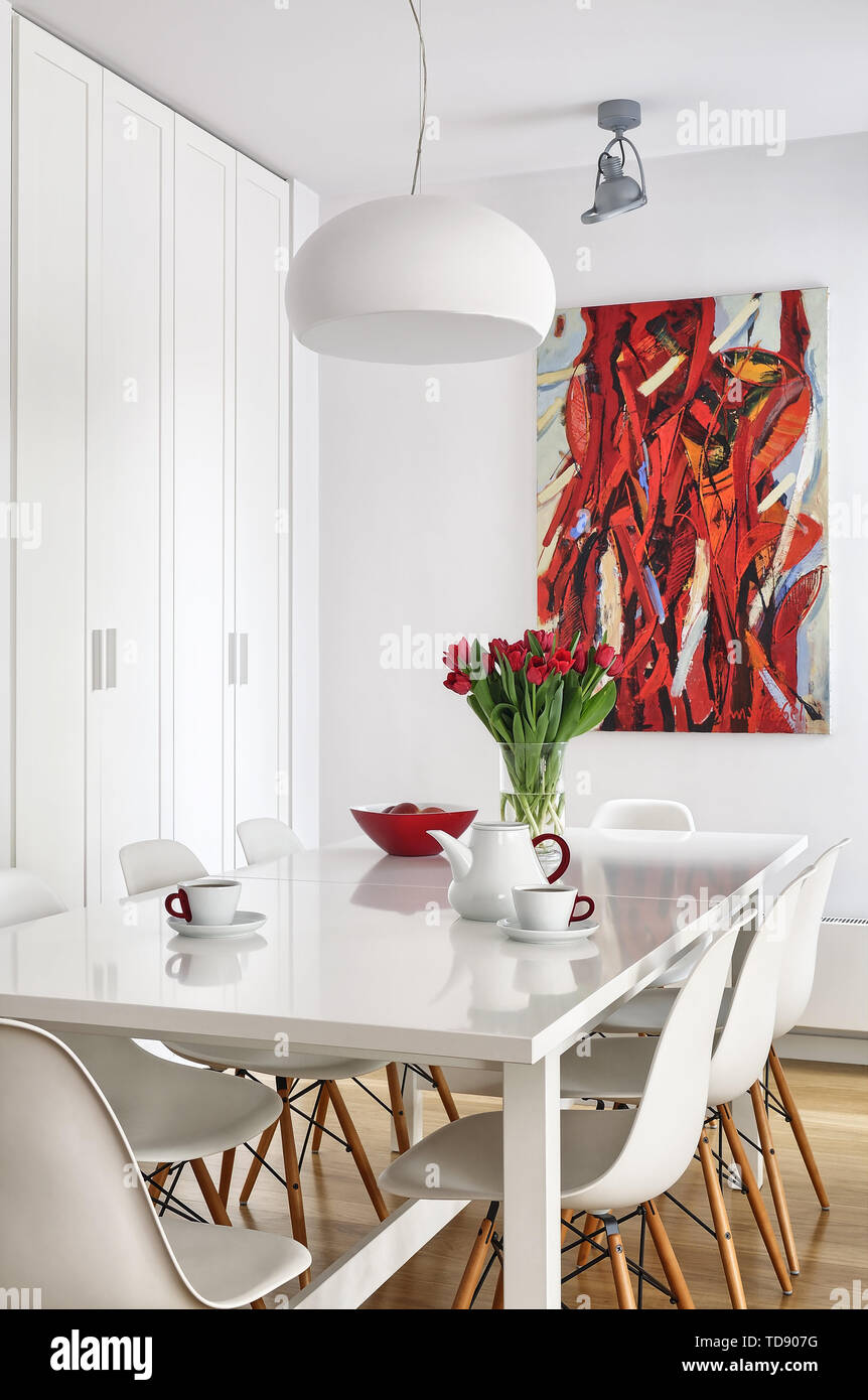 Keramisches Geschirr Und Rote Tulpen Strauss Auf Weiss Hochglanz Esstisch Grossbritannien Irland Nur Verwenden Stockfotografie Alamy