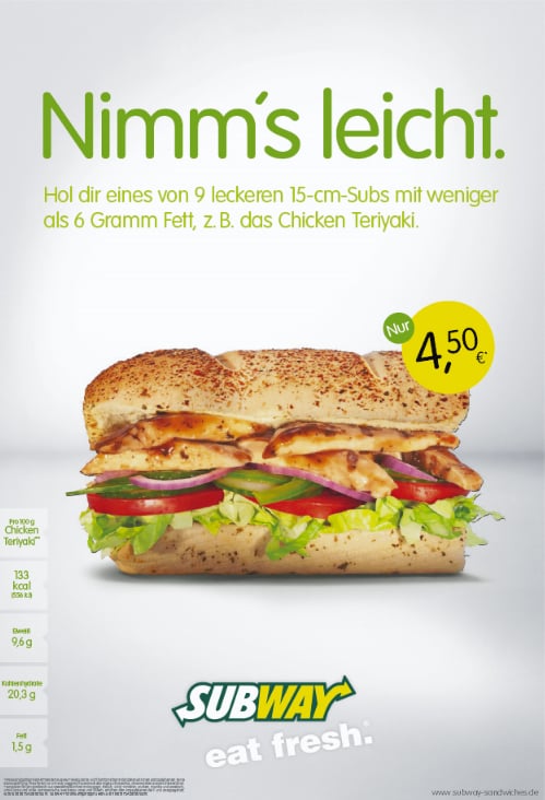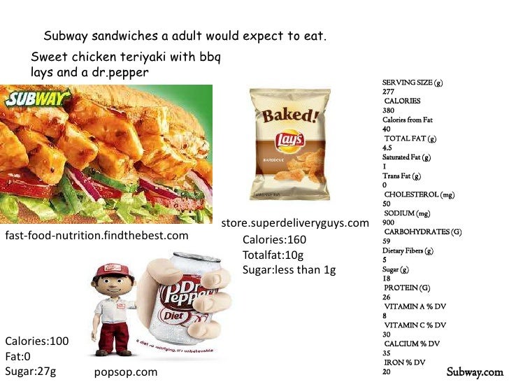 Die originale Rezeptur der TeriyakiSoße ist eine Mischung aus Sojasauce, Mirin oder Sake sowie Zucker oder Honig Durch die TeriyakiSoße erhält das Chicken Fleisch einen ganz besonderen Geschmack, der auch unsere deutschen Fans voll und ganz überzeugt hat Das Chicken Teriyaki Sub ist das beliebteste Subway® Sandwich in Deutschland. Subway teriyaki chicken calories Want create site?. Item Energy (kcal) Total Fat(g) Ham 246 30 Roast Beef 271 43 Roasted Chicken 266 36 Sliced Chicken 244 29 Sliced Chicken & Ham 251 29 Subway Club.