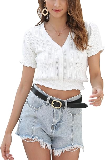 Messbebe Crop Tops Damen Sommer Bluse Bauchfrei V Ausschnitt Oberteil Kurz Baumwolle Ruschenbesatz Kurzarm Taste Stricken Cardigan Amazon De Bekleidung