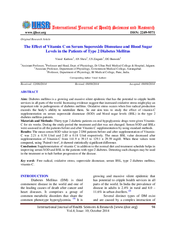 Pdf The Effect Of Vitamin C On Serum Superoxide Dismutase And Blood Sugar Levels In The Patients Of Type 2 Diabetes Mellitus Anjali Shete Academia Edu