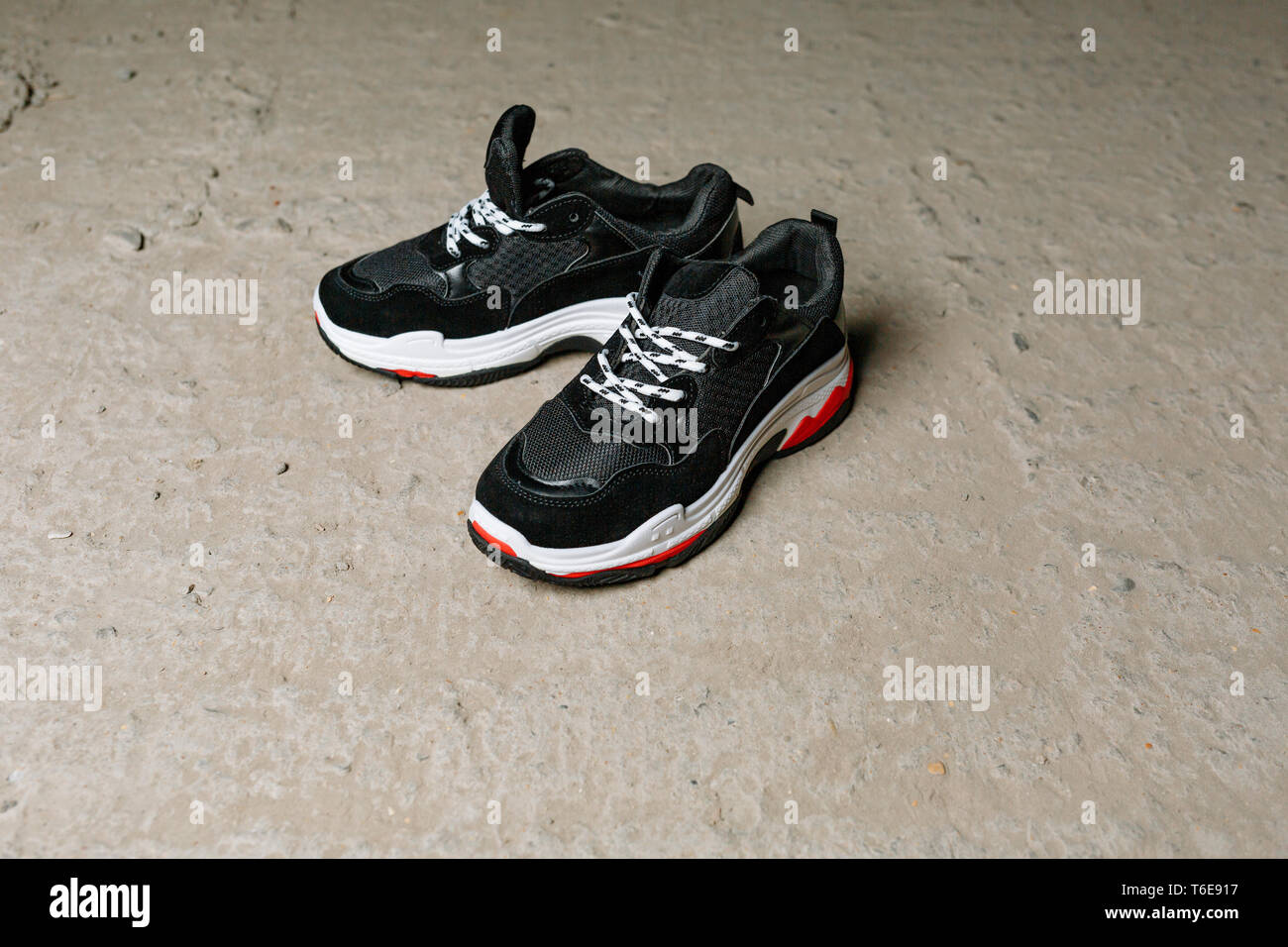 Schwarze Turnschuhe Mit Weissen Schnursenkeln Auf Eine Dicke Weisse Sohle Mit Roten Akzenten Auf Einen Konkreten Hintergrund Stockfotografie Alamy