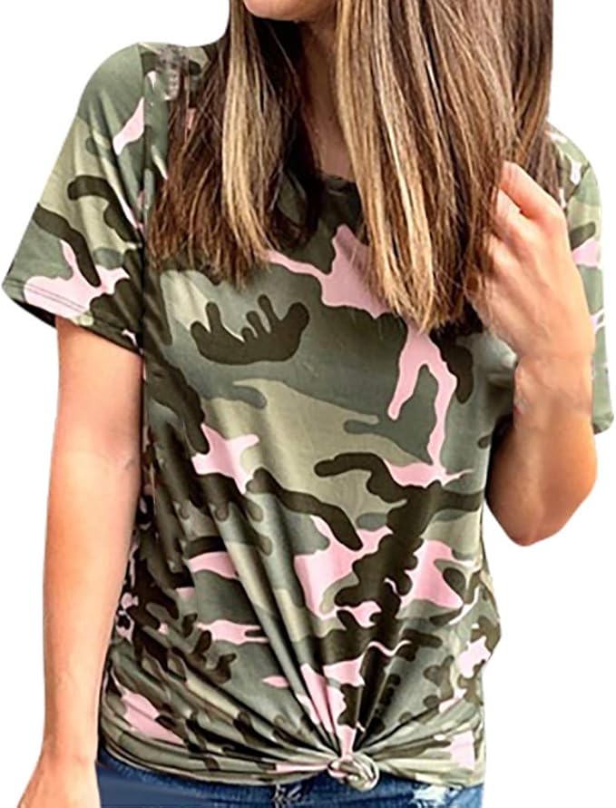 Damen Camouflage Muster Kurzarmeliges T Shirt Knoten Vorne O Ausschnitt Tunika T Shirt Sommer Lose Bluse Shirts In Ubergrosse Gr 38 Rose Amazon De Bekleidung