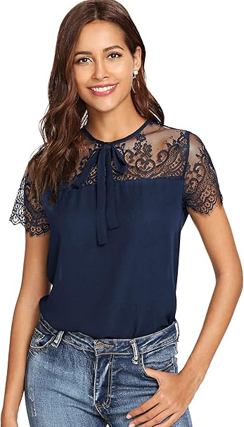 Didk Damen T Shirt Bluse Mit Spitzen Knoten Schleife Vorn Oberteil Tops Amazon De Bekleidung