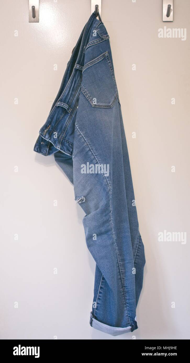 Abgenutzte Zerrissene Jeans Hangt An Einem Haken Auf Eine Weisse Tur Stockfotografie Alamy