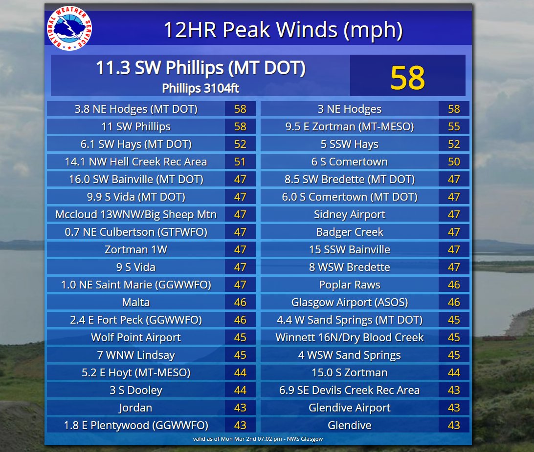 Nws Glasgow Here Are Your Peak Wind Gusts For Today Expect More Of The Same The Next Two Days A High Wind Watch Is In Effect For Tuesday Mtwx Everyoneknowsitswindy