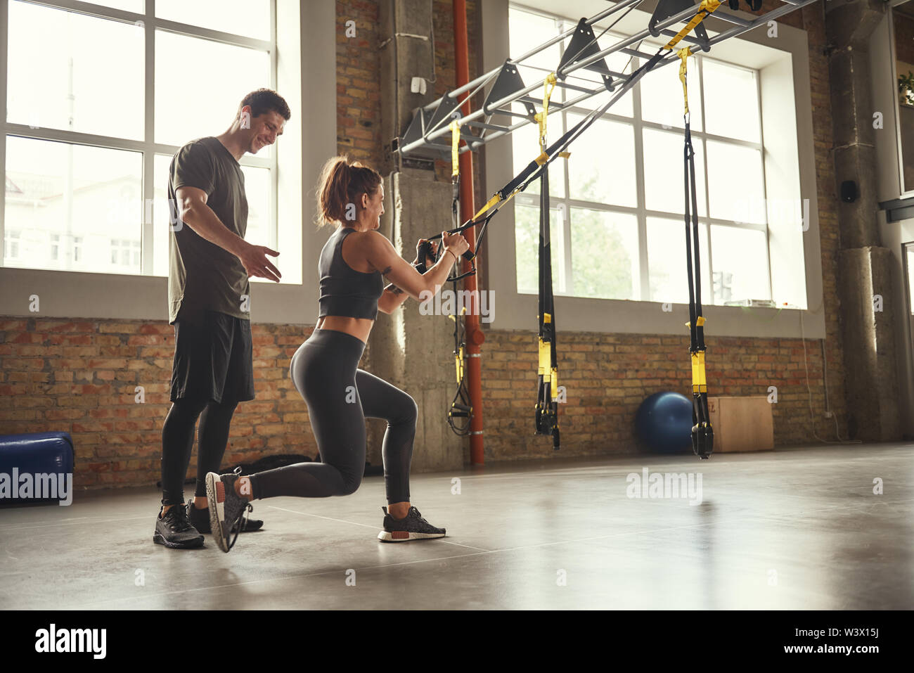 Tun Hocke Ubung Selbstbewussten Jungen Personal Trainer Ist Schlanke Sportliche Frau Wie Kniebeugen Mit Trx Fitness Bander Zu Tun Beim Training Im Fitnessstudio Trx Training Zusammen Trainieren Aktiven Lebensstil Stockfotografie Alamy