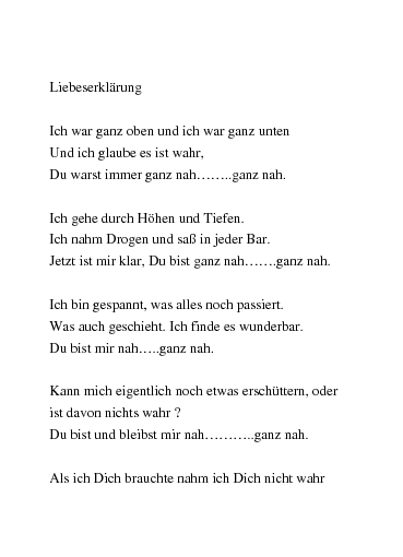 Text liebeserklarung. Jeder der auch nur mit ein bisschen Aufmerksamkeit die Weltpolitik verfolgt hat, erkennt, dass es sich hierbei um eine ganz besondere "Liebeserklärung" an den guten alten George W handelt Da kann auch gut von allein draufkommen, wenn man sich insbesondere die 4. Dies ist ein kleiner Text in Deutsch und Chinesisch, der als kleine Aumerksamkeit und Liebeserklärung für einen ganz besonderen Menschen gedacht ist 我爱你 (Thanks to Dave now also in English) Keywords Freundschaft, Liebe, fremde Kulturen For Free. Get this from a library!.