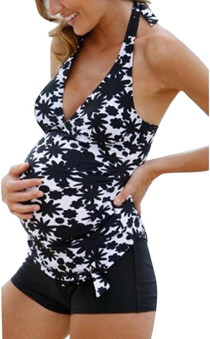 Schwanger Badeanzug Maternity Damen Schwarz Weiss Muster Blumen Umstands Tankini Top Und Shorts Amazon De Bekleidung