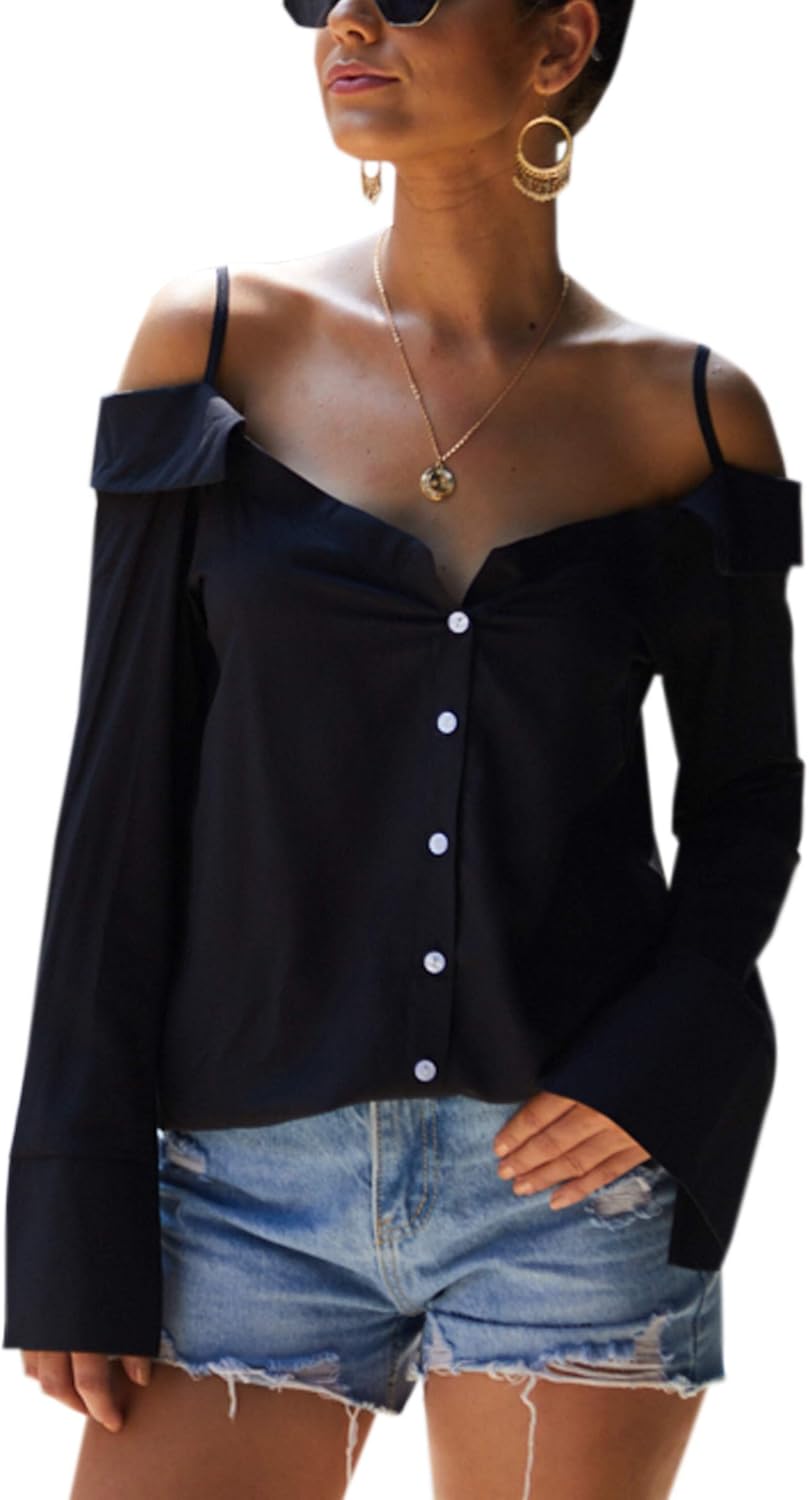 Ecowish Womens Shirts Sexy Spaghetti Strap Off Shoulder Long Sleeve Shirts Casual Button Down Blouse Tops Black M At Amazon Women S Clothing Store