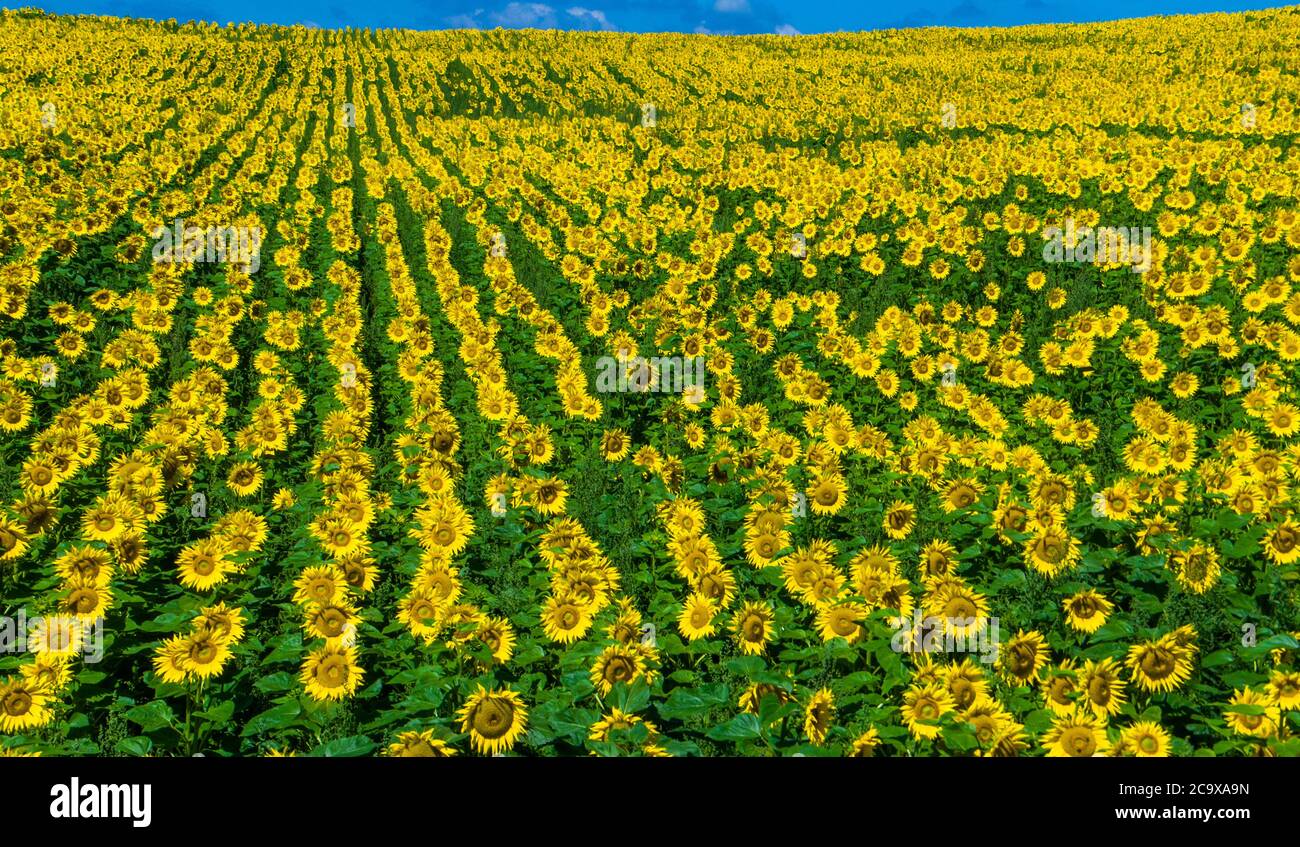 Finkenthal Deutschland Juli Sonnenblumen Bluhen Auf Einem Der Felder Des Furstenhof Erzeugervereins Luftaufnahme Mit Drohne Sonnenblumen Werden Auf Fast 700 Hektar Fur Den Bio Eierproduzenten Angebaut Im September Und Oktober Werden Die
