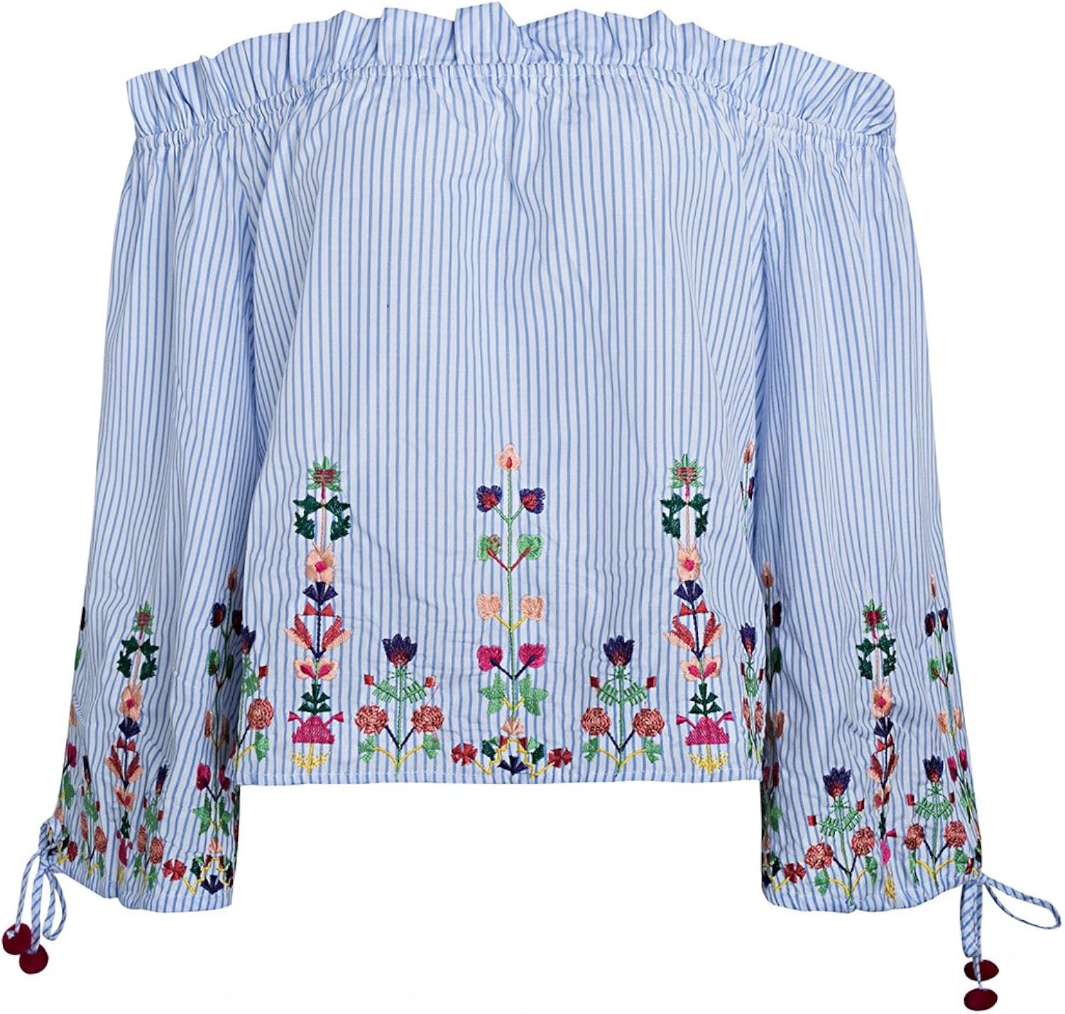 Terryfy Damen Sommer Stickerei Blumen Bluse Schickes Trompetenarmel Off Shoulder Shirts Oberteile Mit Volant Blau Streifen Amazon Co Uk Clothing