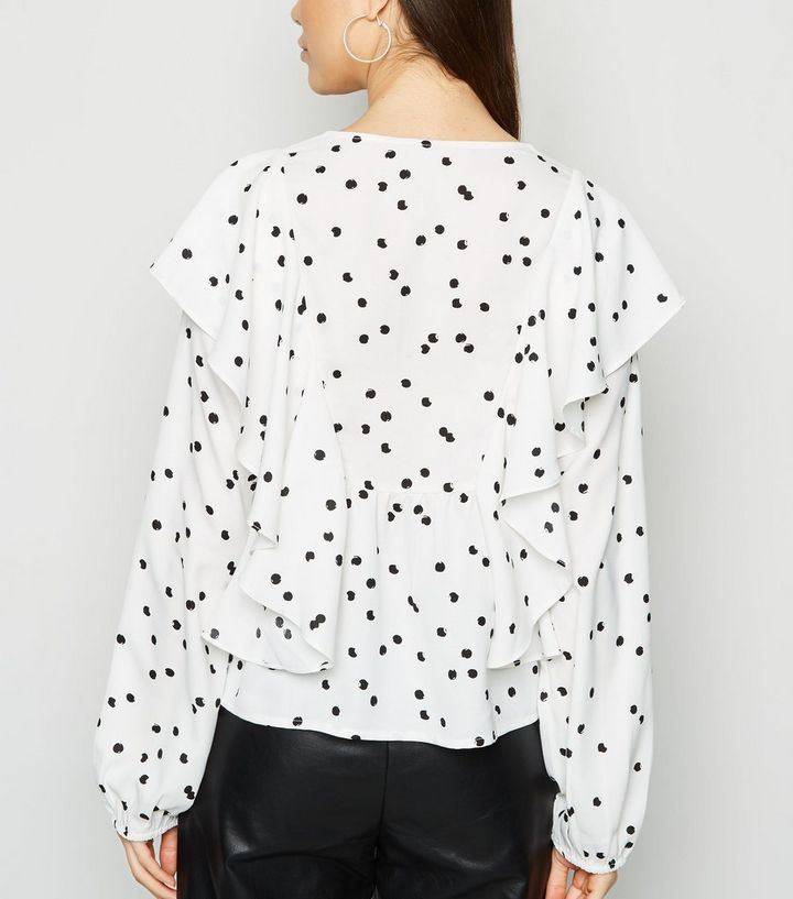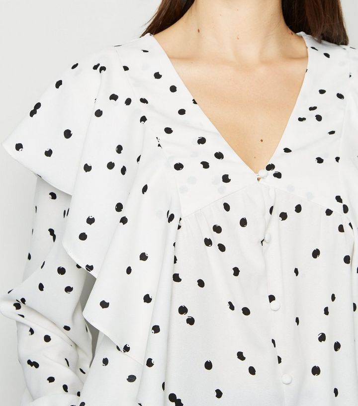Influence Weisse Bluse Mit Punktmuster Ruschenbesatz Und V Ausschnitt New Look