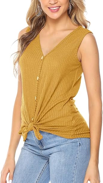 Dancewhale T Shirt Damen Sommer Top Waffel Strick Knoten Bluse Lose Knopfleiste V Ausschnitt Oberteil Tunika Gelb L Amazon De Bekleidung