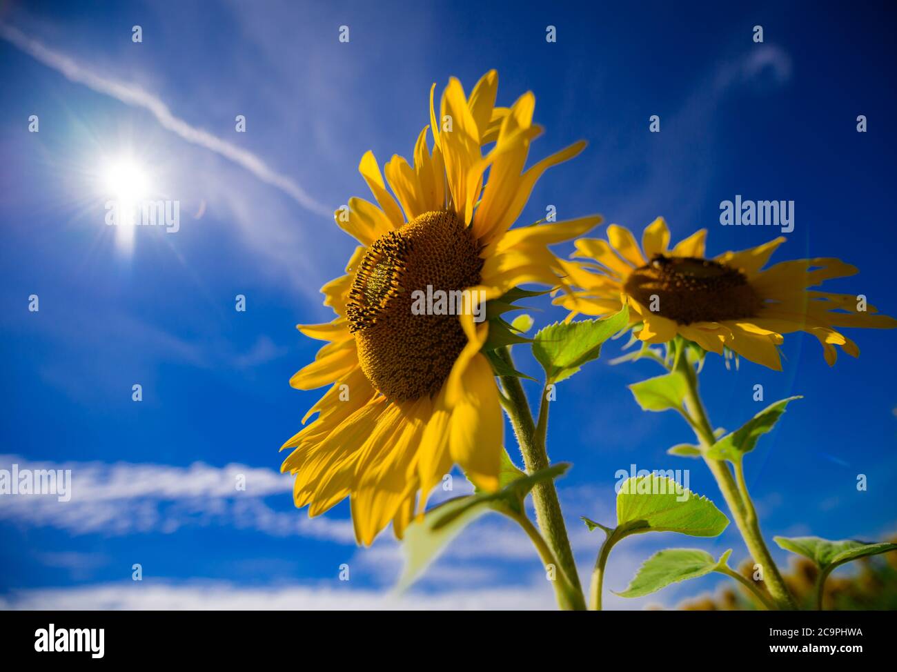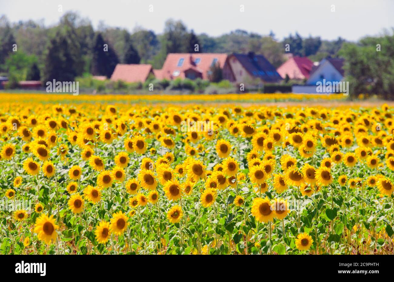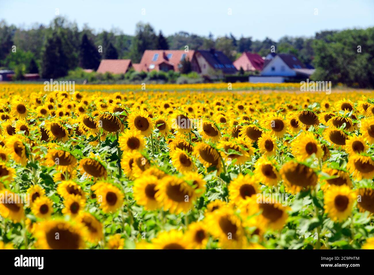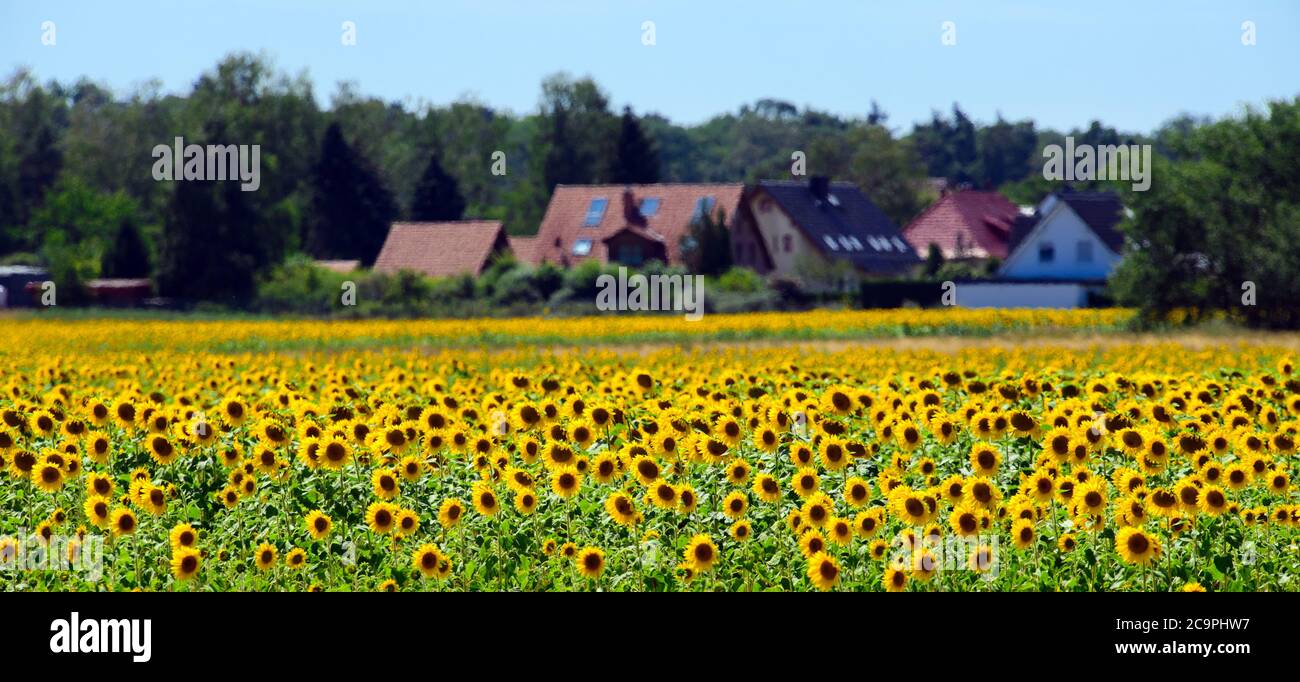 Finkenthal Deutschland Juli Sonnenblumen Bluhen Auf Einem Der Felder Des Furstenhof Erzeugervereins Luftaufnahme Mit Drohne Sonnenblumen Werden Auf Fast 700 Hektar Fur Den Bio Eierproduzenten Angebaut Im September Und Oktober Werden Die