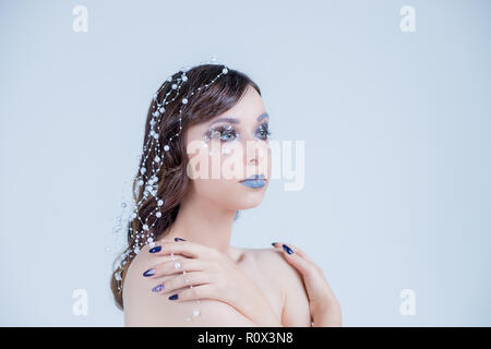 Kreative Ungewohnliche Closeup Portrait Von Snow Queen Kreative Winter Make Up Perfekt Fur Schone Madchen Gesicht Schone Weihnachten Prinzessin Winter Konzept Manikure Perlen Pailletten Schmuck Perlen Kette Stockfotografie Alamy