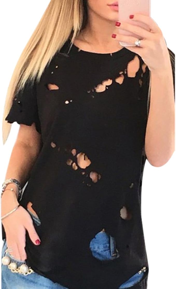 Mioim Damen T Shirt Kurzarm Rundhals Sommer Mode Zerrissene Tops Fashion Baumwolle Beilaufige Lose Oberteile Amazon De Bekleidung