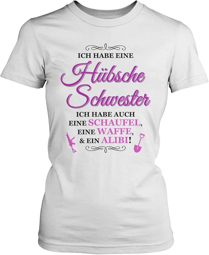Ich Habe Eine Hubsche Schwester Ich Habe Auch Eine Schaufel Eine Waffe Ein Alibi Damen T Shirt Von Fashionalarm Fun Shirt Spruch Spass Geschwister Geburt Geburtstag Geschenk Idee Fur Frauen