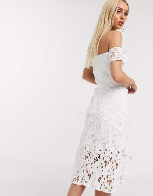 Chi Chi London Weisses Spitzenkleid In Midilange Mit Schwingendem Saum Und Carmenausschnitt Asos